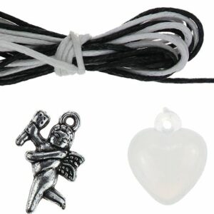 Бусины пластиковые, набор для изготовления украшений, белый тон, элементы — белый жемчуг диаметром 8 мм, серебряные бусины диаметром 8 мм, белые цветы 6х13 мм, подвески-сердечки пластиковые белые 15х18 мм, металлическая ракушка 9х20 мм, купидон 14х22 мм, двухцветная нить. . 30 г.