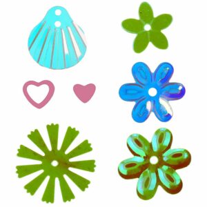 Конфетти, набор смешанных узоров и размеров, узоры: ракушки розового жемчуга, цветы, контур сердца, зеленые цветы. 2х15 г.