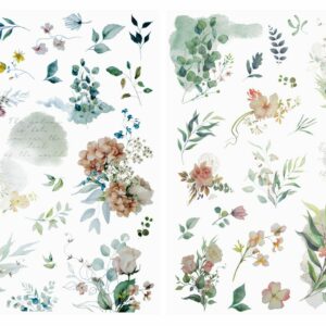 Переводные наклейки цветы зеленые тона 2 листа. Инструкции: вырежьте элемент, который вы хотите использовать, снимите заднюю прозрачную пленку, приклейте элемент к поверхности, прижмите его, затем потрите, снимите переднюю прозрачную пленку..