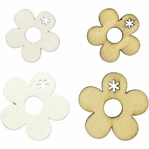 Деревянные цветы, изготовлены из фанеры толщиной 2,5 мм. Цвет: натуральный, белый, размеры: 23 мм/ 30 мм. Упаковка 12 шт.