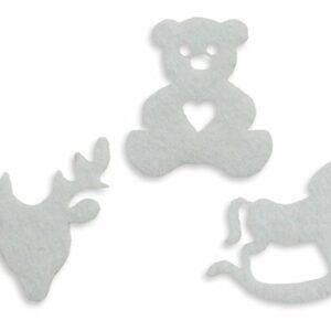 Украшение из белого фетра. Формы: голова северного оленя, плюшевый мишка, лошадка-качалка. Размеры: голова оленя 35 х 36 мм, мишка 32 х 35 мм, лошадка-качалка 37 х 30 мм. Упаковка 12 шт.