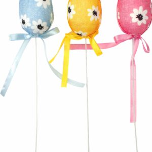 Яйца из пенопласта 40 х 60 мм, с тканевым декором в виде цветов и ленты, на козырьке примерно 19 см, 3 цвета: розовый, желтый, голубой. 6 шт.