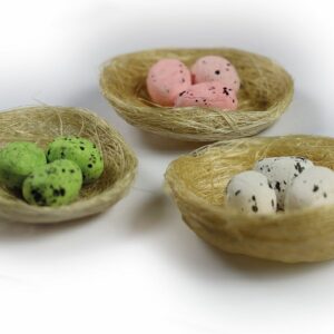 Гнезда из сизали с крапчатыми пенопластовыми яйцами| диаметр гнезда около 75 мм| высота около 20 мм| 3 яйца 18 x 25 мм в гнезде| 3 цвета. 3 розетки.