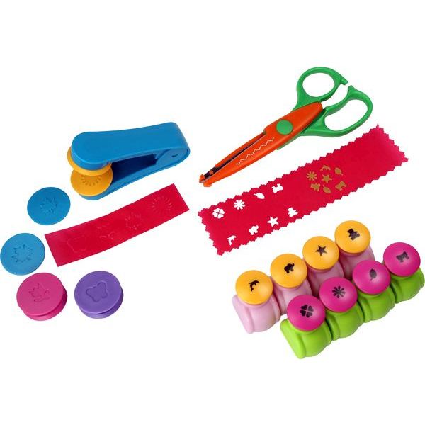Этот набор идеально подходит для всевозможных художественных проектов. Включает в себя: декоративные ножницы, 8 миниатюрных декоративных дыроколов (диаметром 1 см), трафареты: дельфин, слон, звезда, плюшевый мишка, клевер, цветок, лист, бант, а также бумажный тиснитель с 4 сменными трафаретами: лист, цветок, бабочка и солнце.