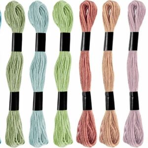 Вышивка крестом в наборе из 12 пастельных тонов. Длина каждого мотка 8 м. Используется в основном для вышивания, а также для других поделок, в том числе: отделка закладок, альбомов, поздравительных открыток и украшений ручной работы, например плетение браслетов.