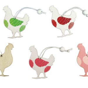 Подвески деревянные, узор: курочки, размеры: 48 х 62 мм, с белой бусиной 10 мм на нитке, цвета: бело-зеленый, розово-белый, бело-розовый, бело-красный. 4 шт.