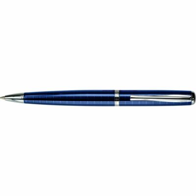 Металлическая шариковая ручка с едва заметным клетчатым узором на корпусе, серебристым покрытием и поворотным выдвижным механизмом. Сменный синий стержень большой емкости. Толщина линии: 0,7 мм. Упакована в полиэтиленовый пакет.